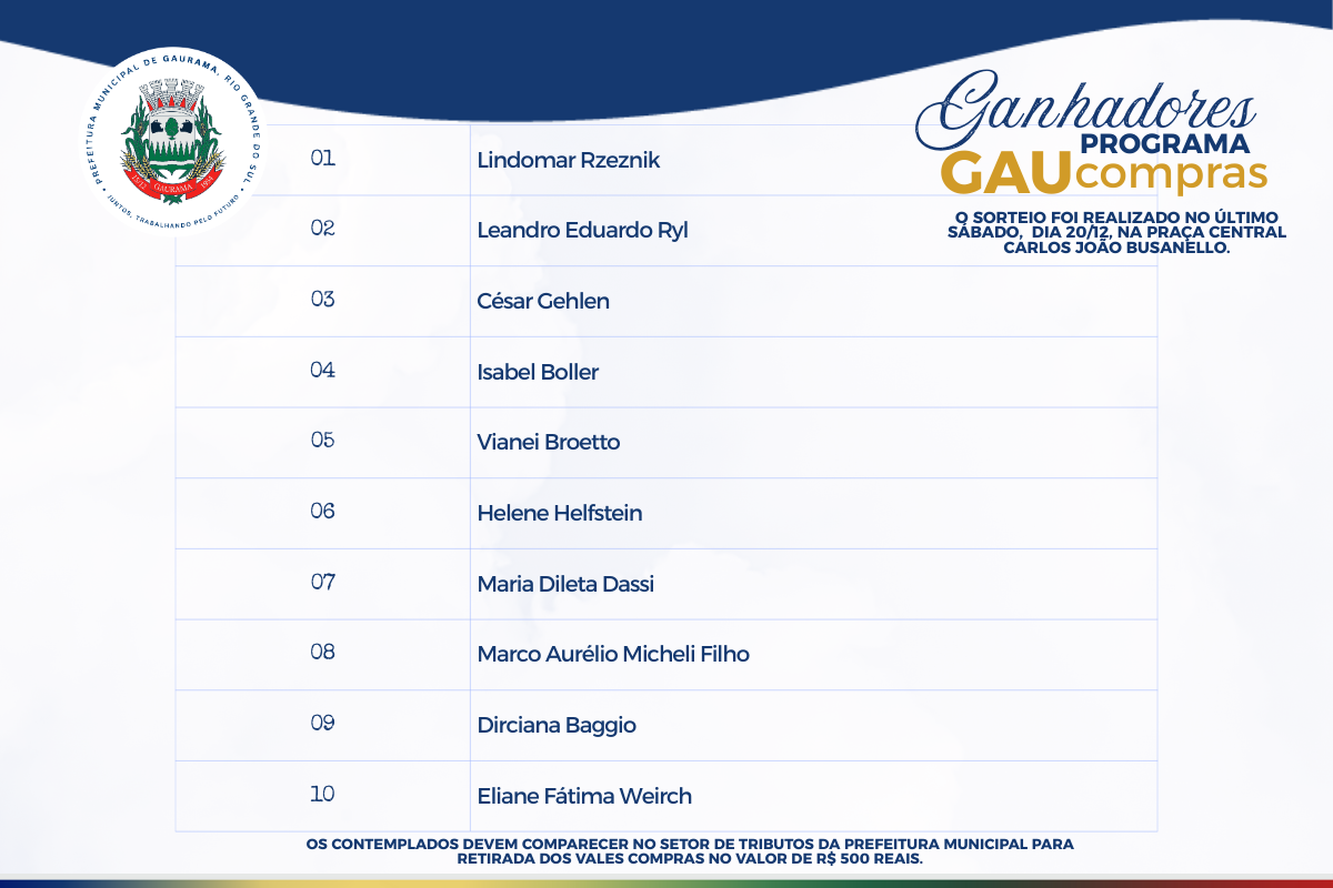 A Prefeitura de Gaurama divulga os contemplados no sorteio do Programa GauCompras, realizado no último sábado, 20/12, na Praça Central Carlos João Busanello.