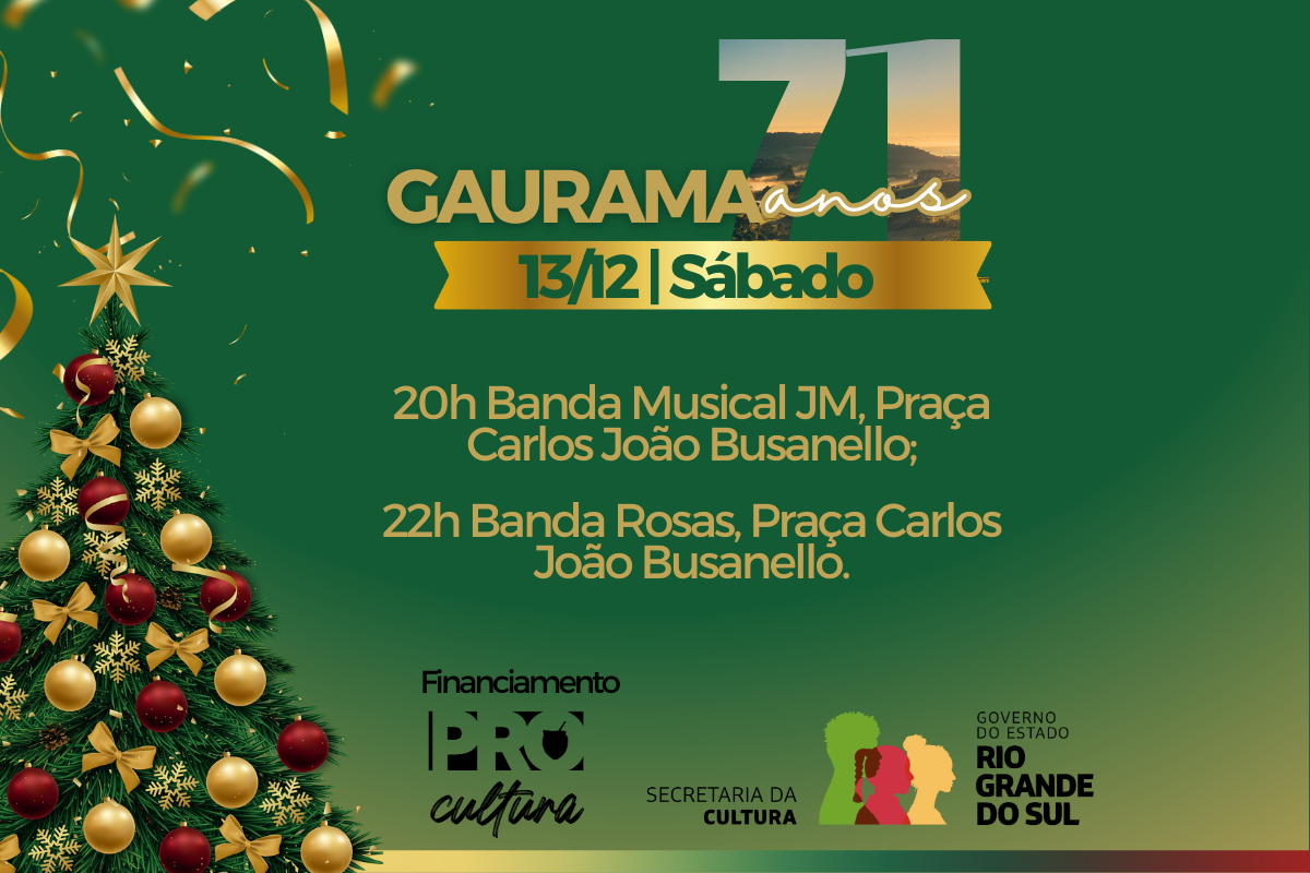 A magia do Natal de Todos 2025 fica ainda mais completa com a programação dos 71 anos de Gaurama — shows, apresentações artísticas, mateada, sorteio do GAUcompras e muita diversão!