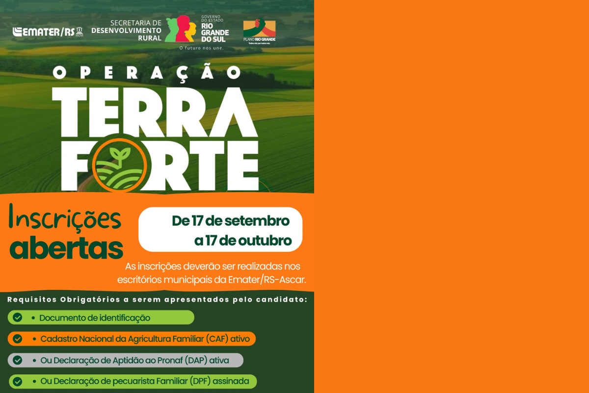 O Escritório Municipal da Emater de Gaurama e Secretária da Agricultura informam que estão abertas as inscrições para a operação Terra Forte, que contará com 40 beneficiários no Município. Inscrições na Emater até 17 de Outubro.