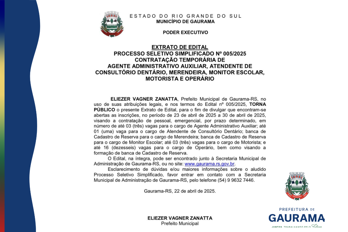 Edital de Seleção Nº 005/2025 Contratação Temporária de Agente Administrativo Auxiliar, Atendente de Consultório Dentário, Merendeira, Monitor Escolar, Motorista e Operário.
